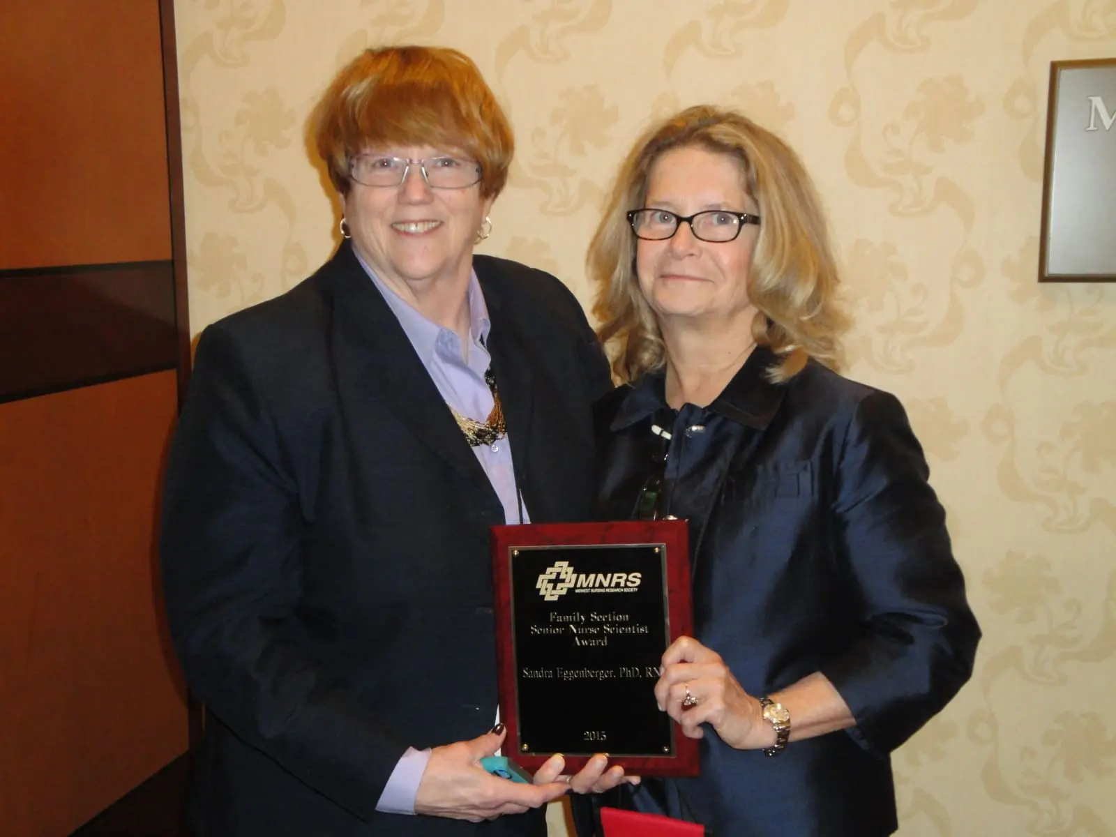 Dr. Sandra Eggenberger (right) receives MNRS 2015 Senior Nurse Scientist Award from Dr. Kathleen Sawin (left)